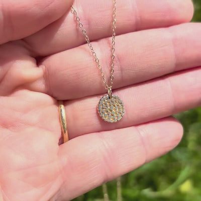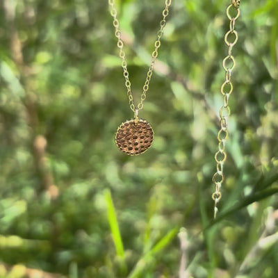 The pendant is made in shiny 14ct solid gold, with the recessed areas given a soft matte finish to enhance the intricate wattle blossom design. It is suspended from a delicate and sparkly 14ct gold chain, secured with a solid gold clasp. The adjustable chain allows for versatile wear at 45cm (18") or 50cm (20"), slightly shorter than our silver necklaces. A hallmarked 14ct gold necklace tag completes the piece.